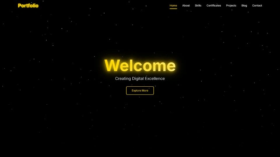 A portfolio website showcasing my skills, certificates, and projects with black and gold theme featuring animated stars and smooth interactions.
